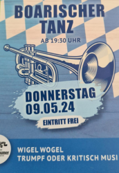12:00 Uhr: Mittagstisch mit Hend 13:00 Uhr: Preisplattln des GTEV "Surtal" Lauter 16:00 Uhr: Bierzeltbetrieb mit Hendl und freies Musizieren 19:30 Uhr: Boarischer Tanz mit "Wigel Wogel" und "Trumpf oder Kritisch Musi" EINTRITT FREI!