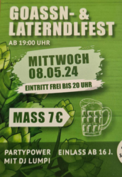 19:00 Uhr: Goassn- & Laterndlfest Partypower mit "DJ Lumpi" Eintritt 7 € (bis 20:00 Uhr freier Eintritt) Einlass ab 16 Jahren